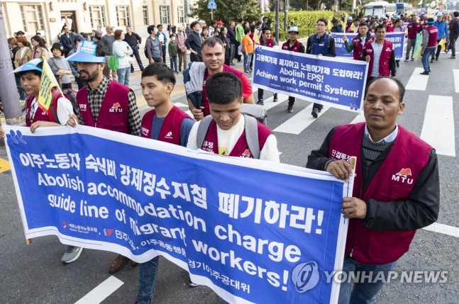 (서울=연합뉴스) 윤동진 기자 = 20일 오후 서울파이낸스센터 앞에서 열린 2019 전국이주노동자대회에서 참석자들이 광화문 방향으로 행진하고 있다. 2019.10.20