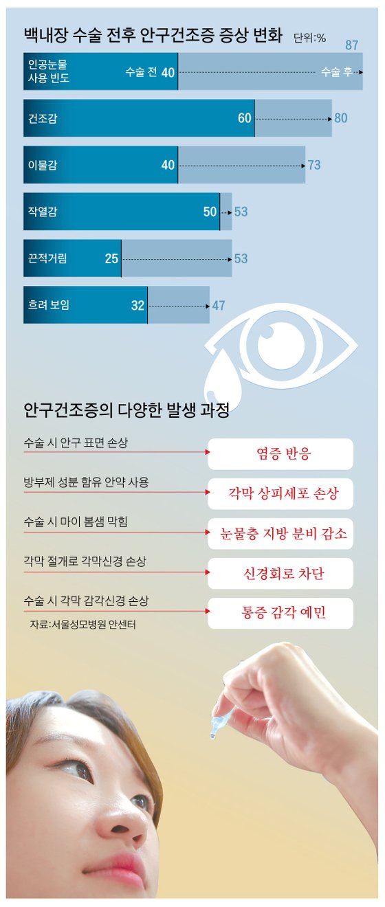 그래픽=박춘환 기자 park.choonhwan@joongang.co.kr 안구건조증은 다양한 원인에 의해 안구표면, 특히 눈물층의 균형이 깨진 결과다. 2010년 국민건강영양조사에 따르면 한국인의 안구건조증 유병률은 16%다. 나이와 안과적 수술 여부, 스트레스, 갑상샘질환 그리고 고학력 등이 위험인자다. 라식이나 라섹 수술을 받은 사람의 약 43%가 안구건조증을 겪는다. 하지만 백내장 수술 후에도 안구건조증으로 인해 불편을 호소하는 환자가 많은데, 이는 수술의 결과에도 악영향을 줄 수 있다. 일반적으로 백내장 수술로 인해 수술 전 안구건조증이 있던 환자는 건조증이 더욱 악화하고, 안구건조증이 없던 환자도 약 20%는 안구건조증이 생긴다.