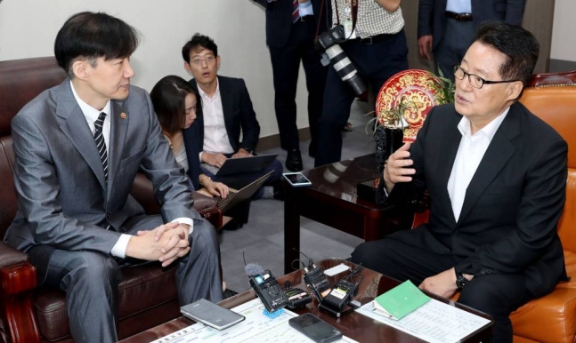 조국 법무부 장관이 19일 오전 서울 여의도 국회를 방문해 대안정치연대 박지원 의원을 예방하고 있다. / 사진=홍봉진 기자 honggga@