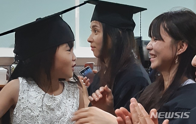 【음성=뉴시스】 김재광 기자 = 지난달 7일 충북 음성군건강가정다문화가족지원센터 금왕분소에서 열린 다문화엄마학교 1기 졸업식에 참석한 졸업생이 딸에게 학사모를 씌워주고 있다.2019.10.14.(사진=음성군 제공)photo@newsis.com