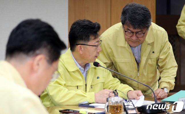 (세종=뉴스1) 장수영 기자 = 김현수 농림축산식품부 장관이 2일 정부세종청사 농식품부 아프리카돼지열병(ASF) 방역상황실에서 열린 농식품부-지자체 ASF 상황점검회의에서 직원들과 대책 논의하고 있다.