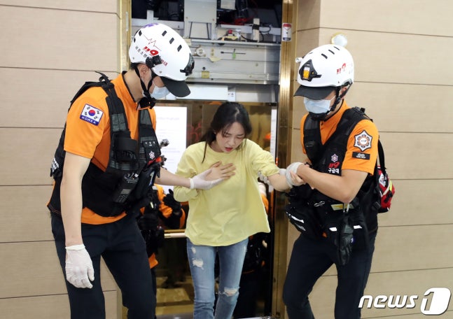 (세종=뉴스1) 장수영 기자 = 30일 세종시 어진동 정부세종컨벤션센터에서 열린 승강기 사고대응 합동훈련에서 119구조대 대원들이 승강기에 갇힌 승객을 구조하고 있다. 2019.9.30/뉴스1