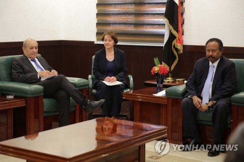 French Foreign Minister Jean-Yves Le Drian (L) meets with Sudanese Prime Minister Abdalla Hamdok (R) in Khartoum, Sudan, 16 September 2019. Le Drian arrived in Khartoum for meetings with Sudanese officials to show support for the new government and discuss means of support during the transitional period. EPA/MARWAN ALI