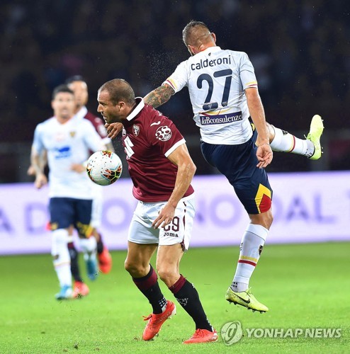 Torino's Lorenzo De Silvestri (L) in action against Lecce's Marco Calderoni (R) during the Italian Serie A soccer match between Torino FC and US Lecce at the Olimpico Grande Torino stadium in Turin, Italy, 16 September 2019. EPA/ALESSANDRO DI MARCO