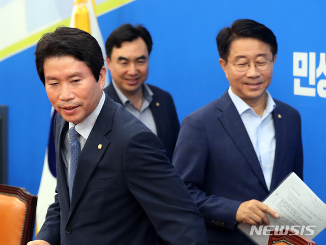【서울=뉴시스】고승민 기자 = 더불어민주당 이인영 원내대표와 조정식 정책위의장, 윤관석 정책위수석부의장이 15일 서울 여의도 국회에서 현안 관련 기자간담회를 하기 위해 회의실로 들어서고 있다. 2019.09.15.