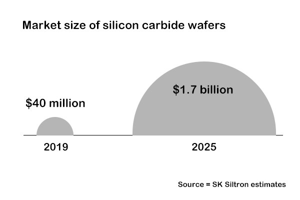 SK Siltron expects the global SiC wafer market will grow from $40 million this year to $1.7 billion in 2025 in line with burgeoning demand for EVs worldwide.