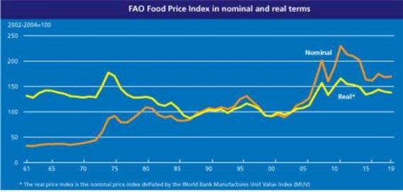 FAO는 1990년 이후 23개 품목에 대한 국제가격동향(73개)을 모니터링, 5개 품목군(곡물, 유지류, 육류, 유제품, 설탕)별로 매월 작성·발표한다. 2002~2004년 평균은 100이다.