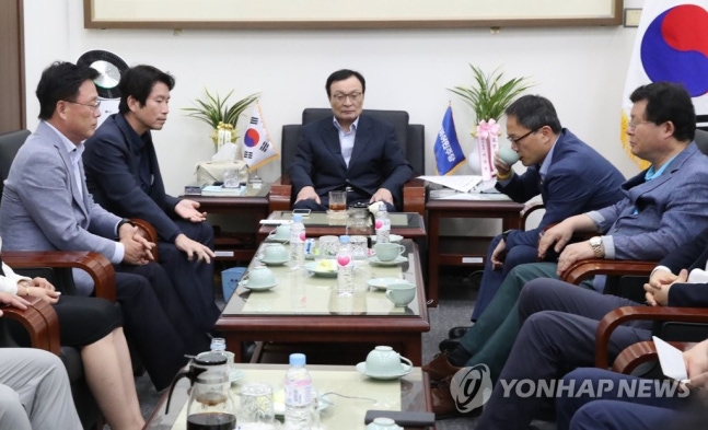 (서울=연합뉴스) 이진욱 기자 = 8일 오후 국회에서 열린 더불어민주당 최고위원회의에 이해찬 대표와 이인영 원내대표 등 참석자들이 굳은 표정으로 참석해 있다. 2019.9.8