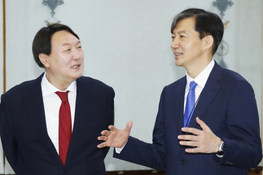 윤석열 검찰총장(좌)이 지난 7월 청와대에서 당시 민정수석이었던 조국 법무부 장관 후보자와 대화하고 있다. [연합]