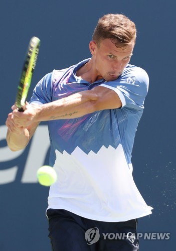 Marton Fucsovics of Hungary hits a return to Nikoloz Basilashvili of Georgia during their match on the first day of the US Open Tennis Championships the USTA National Tennis Center in Flushing Meadows, New York, USA, 26 August 2019. The US Open runs from 26 August through 08 September. EPA/DANIEL MURPHY