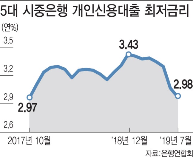 올 들어 5대 시중은행의 신용대출 최저금리는 계속 하락세다. 1월 연 3.41%(우리)에서 3월 3.39%(우리), 5월 3.30%(하나), 7월 2.98%(하나)로 하락, 반년 만에 0.43%포인트 떨어졌다.