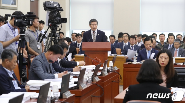 (서울=뉴스1) 임세영 기자 = 정경두 국방부 장관이 21일 오전 서울 여의도 국회에서 열린 국방위원회 전체회의에서 제안설명을 하고 있다. 2019.8.21/뉴스1
