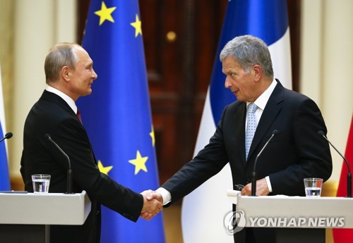 Finnish President Sauli Niinisto (R) and Russian President Vladimir Putin (L) shake hands during a joint news conference following their talks at the Presidential Palace in Helsinki, Finland, 21 August 2019. Russian President Vladimir Putin pays a working visit to Helsinki. EPA/ALEXANDER ZEMLIANICHENKO/POOL