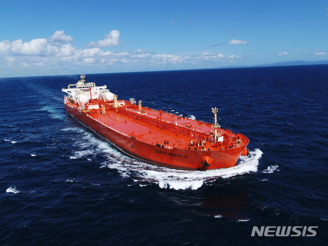 【서울=뉴시스】삼성중공업이 올해 첫 인도한 LNG 연료추진 원유운반선.【서울=뉴시스】김지은 기자 = 삼성중공업이 7513억원 규모의 액화천연가스(LNG) 연료추진 원유 운반선 10척을 따내며 업계에서 가장 먼저 올해 수주 목표 절반을 넘어섰다.