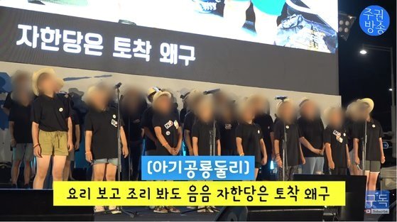 [주권방송 유튜브 캡처] 초·중학생으로 보이는 청소년들이 ‘자유한국당 해체’를 요구하는 내용의 노래를 합창한 영상이 확산되면서 논란이 일고 있다. 어린 학생들을 정치 도구로 이용했다는 비판이 줄을 잇고 있지만 일부는 “아이들이 보다못해 나선 것”이라고 주장하고 있다.