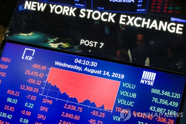 미국 다우지수, 올해 최대 낙폭 / 사진=연합뉴스글로벌 경제의 침체 우려가 증폭하면서 미국 뉴욕증시를 강타했습니다. 이번에는 채권시장을 중심으로 '경고음'이 나오면서 투자자들이 민감하게 반응했습니다.