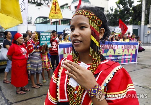 Rurelyn Bay-ao from the Manobo indigenous group in the southern Philippines speaks to the media during a rally held by human rights advocates and representatives from Filipino indigenous tribes outside the Armed Forces of the Philippines camp in Quezon City, Philippines, 09 August 2019. The rally marked International Day of the World's Indigenous Peoples. The protesters called for an end to the harassment of indigenous groups by government security forces and an end to the damage done to indigenous lands by private firms. EPA/ROLEX DELA PENA