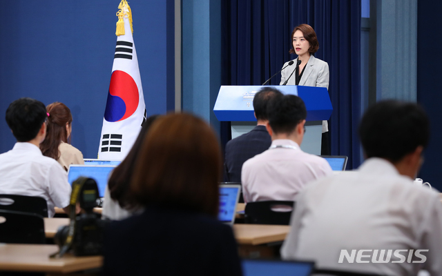 【서울=뉴시스】전신 기자 = 고민정 대변인이 9일 청와대 춘추관 대브리핑룸에서 8개의 장관급 직위를 교체하는 개각 인사 발표를 하고 있다.