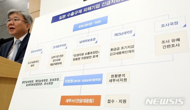【세종=뉴시스】강종민 기자 = 임성빈 국세청 법인납세국장이 5일 오전 정부세종청사에서 일본의 백색국가 배제조치로 수출규제가 강화된 품목을 수입하거나 수입하는 기업과 거래관계가 있어 피해를 입는 중소기업을 대상으로 세정지원 대책을 추진한다고 밝히고 있다. 2019.08.05.