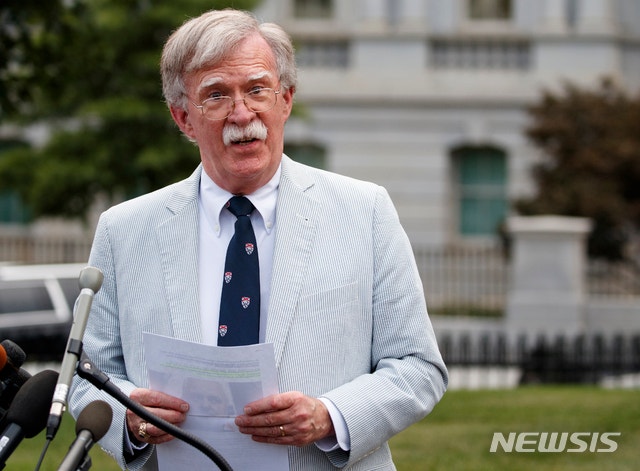 【워싱턴=AP/뉴시스】존 볼턴 미 국가안보 보좌관이 7월 31일(현지시간) 백악관에서 취재진과 얘기하고 있다.