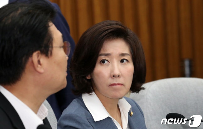 (서울=뉴스1) 김명섭 기자 = 나경원 자유한국당 원내대표가 26일 서울 여의도 국회에서 열린 원내대책회의에서 정용기 정책위 의장과 대화를 하고 있다. 2019.7.26/뉴스1