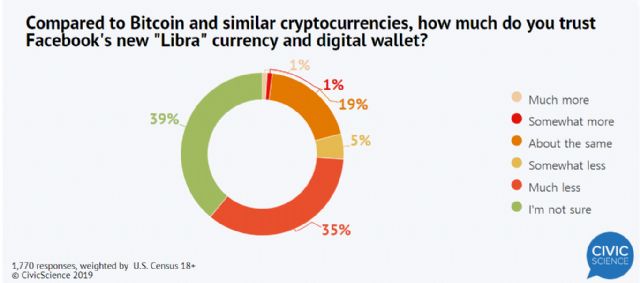 설문조사 결과에 따르면, 응답자의 40%가 페이스북의 리브라 코인보다 비트코인을 비롯한 다른 암호화폐를 더 신뢰하는 것으로 나타났다. 리브라를 비트코인보다 더 신뢰한다고 응답한 비율은 2%에 그쳤다. 19%는 신뢰도가 같다고 답했으며, 39%가 잘 모르겠다고 답했다.