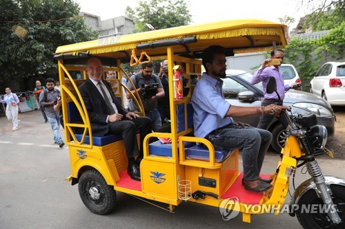 UN Secretary-Generals Special Envoy for the 2019 Climate Change Summit, Luis Alfonso de Alba (L) takes a ride in E-RIckshaw to create awareness in New Delhi, India, 23 July 2019. According to a press release, the United Nations is announcing the 'Clean Air' Initiative and calling on Governments at all levels to join the initiative. EPA/RAJAT GUPTA