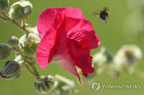 A bumblebee leaves a flower in a park in Berlin, Germany, 23 July 2019. Germany is in a new heat wave with temperatures of over 30 degrees Celsius in the next few days. EPA/FELIPE TRUEBA