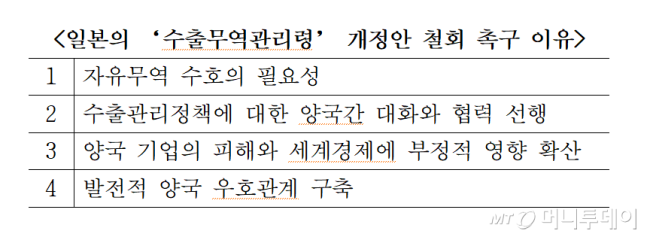 경제 5단체는 개정안 철회 촉구 이유로 우선 한국과 일본이 수호해온 자유무역의 원칙을 저해할 수 있다는 점을 지적했다. 양국은 자유무역의 근간을 훼손하지 않는 범위 내에서 수출통제 및 관리제도를 효율적으로 운용해왔으며, 같은 맥락에서 이번 개정안도 재고되어야 한다는 것이다.