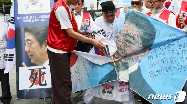 (서울=뉴스1) 허경 기자 = 독도사랑세계연대 회원들이 23일 서울 종로구 옛 일본대사관 앞에서 열린 일본정부 규탄대회에서 경제 보복 조치를 규탄하며 아베 총리의 사진을 찢고 있다. 2019.7.23/뉴스1
