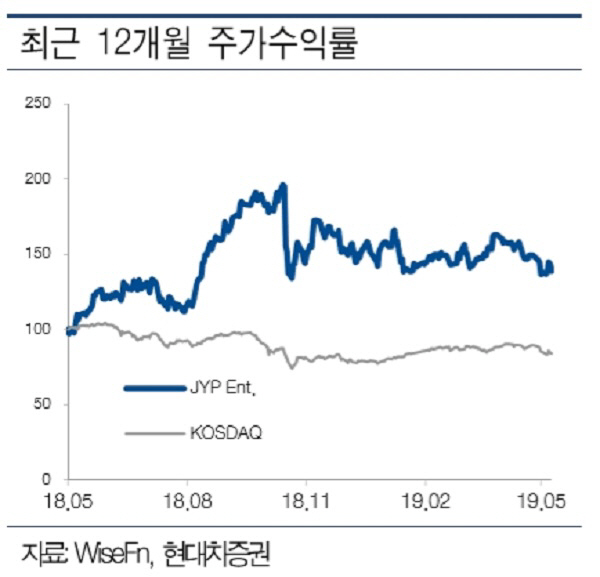 유성만 현대차증권 연구원은 "1분기 음반, 음원, 콘서트 매출 반영으로 비수기에도 경쟁사 대비 실적이 선방했다"며 "2분기에는 트와이스, GOT7, 스트레이키즈 앨범 모멘텀과 월드투어 실적이 반영될 것으로 예상된다"고 설명했다.