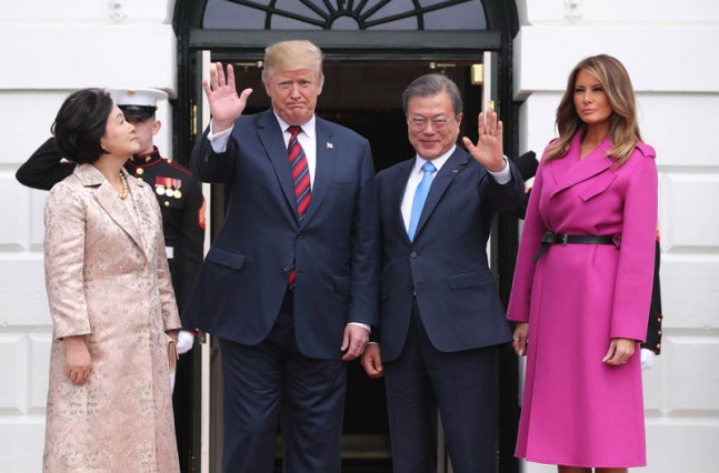 ▲ 문재인 대통령과 트럼프 미 대통령 내외가 지난달 11일 워싱턴에서 정상회담을 위해 회동하고 있다. 사진=청와대