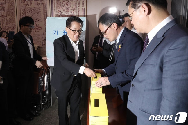 (서울=뉴스1) 김명섭 기자 = 박지원 민주평화당 의원이 29일 오후 서울 여의도 국회 본청에서 열린 국회 사법개혁특별위원회(사개특위) 전체회의에서 검경수사권 조정과 공수처 설치법의 패스트트랙 관련 투표를 하고 있다. 2019.4.30/뉴스1