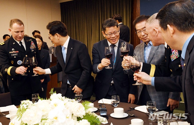 【판문점=뉴시스】사진공동취재단 = 4.27 판문점 선언 1주년 기념식이 열린 27일 오후 경기 파주시 판문점 만찬장에서 로버트 에이부럼스 한미연합사령관이 건배제의를 하고있다. 2019.04.28.