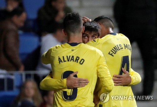 Villarreal's Gerard Moreno (C) celebrates with teammates after scoring during a Spanish LaLiga soccer match between Real Sociedad and Villarreal at Anoeta stadium in San Sebastian, northern Spain, 25 April 2019. EPA/Javier Etxezarreta