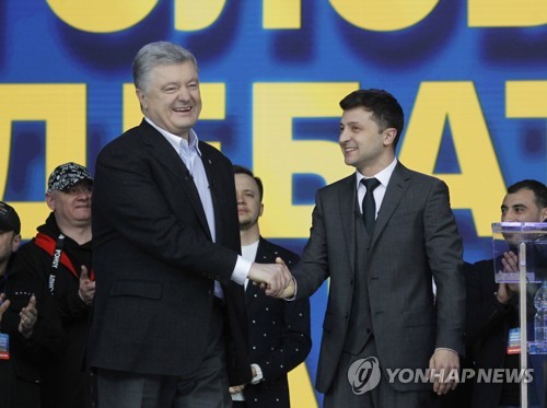 Presidential candidates Petro Poroshenko (L) and Volodymyr Zelensky (R) shake hands, as they participate in debates at the Olimpiyskiy Stadium in Kiev, Ukraine, 19 April 2019. Presidential candidates Petro Poroshenko and Volodymyr Zelensky visit the Olimpiyskiy Stadium to take part in the debates ahead of the second round of the presidential elections which will be held on 21 April 2019. After the first round of elections, showman Volodymyr Zelensky remains a frontrunner with 30.24 percent of votes and incumbent president Petro Poroshenko is a runner-up with 15.95 percent of votes. EPA/SERGEY DOLZHENKO