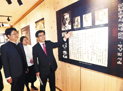 임성빈 장로회신학대 총장(왼쪽 세 번째)이 6일 서울 광진구 장신대 마포삼열기념관 2층 전시실에서 3·1운동 민족대표 관련 전시물을 설명하고 있다.강민석 선임기자