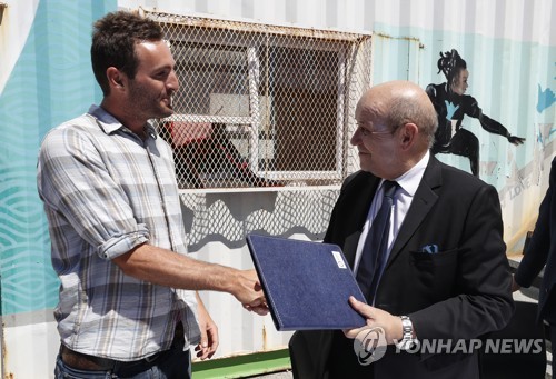 French Minister for Europe and Foreign Affairs, Jean-Yves Le Drian (R) and Timothy Conibear (L) Founder and Director of Waves for Change during a ceremony to mark the handing over of a grant from the Agence Francaise de Developpement (AFD) to the South African Non-Governmental Organization (NGO) Waves for Change in Monwabisi, Cape Town, South Africa, 01 March 2019. The 100,000 euros grant will allow this South African NGO that provides mental health support to vulnerable youth through learn-to-surf programs, to conduct a pilot project aimed at demonstrating the sustainability and social impact of a new activity. In order to reach more young people and expand its programs to remote areas of South Africa, Waves for Change plans to use a mobile application to track the work of independent coaches, allowing coaches to open new sporting program, report on the location, duration and the number of participants each activity engages, while enabling them to receive direct payment. EPA/NIC BOTHMA