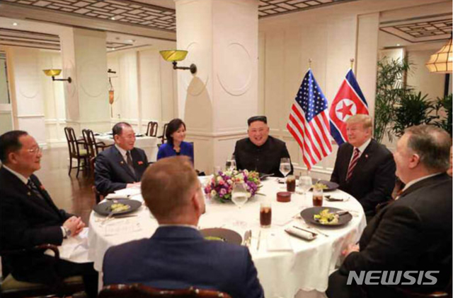 【서울=뉴시스】 북한 노동신문은 지난 27일(현지시각) 베트남 하노이 메트로폴 호텔 회담장에서 김정은 국무위원장이 도널드 트럼프 미국 대통령과 단독회담과 만찬을 했다고 28일 보도했다. 2019.02.28. (출처=노동신문)