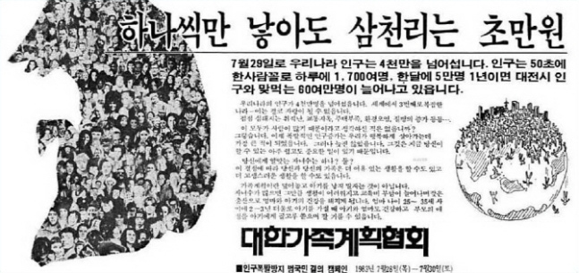 당시 정부는 ‘하나만 낳아 잘 기르자’는 표어를 내세워 산아제한정책을 펼쳤다. 정책의 효과는 상당했다. 1981년 86만7000명이던 출생아 수는 1982년 84만8000명, 1983년 76만9000명으로 떨어졌다.