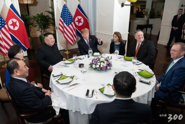 트럼프 대통령 옆으로는 마이크 폼페이오 국무장관과 믹 멀베이니 백악관 비서실장 직무대행이 앉았다. 김 위원장 왼편으로는 김영철 노동당 부위원장 겸 통일전선부장과 리용호 외무상이 순서대로 앉았다. 원탁임을 고려하면 리 외무상 옆자리가 멀베이니 비서실장 직무대행이 되는 셈이다.