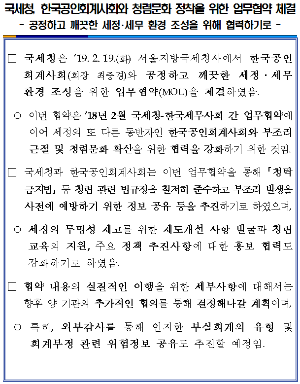 국세청, 한국공인회계사회와 청렴문화 정착을 위한 업무협약 체결